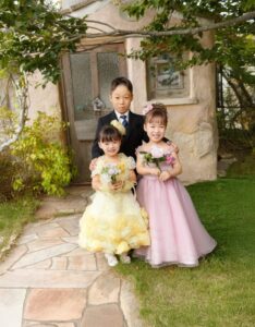 ドレスでは、黄色のドレスを着て👗3人きょうだいさんで