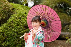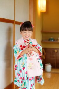 水色にイチゴ🍓柄のお着物に、ピンク色の被布。