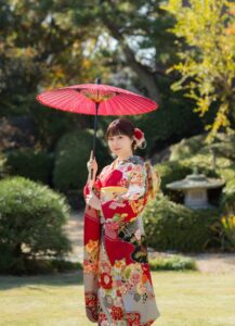 庭園の緑に振袖と傘の赤が良く映えます😳