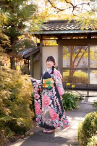 黒字にピンクやオレンジ色の牡丹や梅が鮮やかに描かれた総絞りの振袖✨